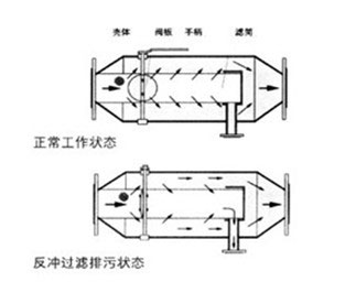 手 動蝶閥關閉,即閥板平面與筒體軸線垂直,(此時扳手旋轉90度與筒體軸線垂直),開啟排污閥,此時水流從進口進入過濾網(wǎng)筒前端,因蝶閥關閉,水流被閥板擋住,只能從前端網(wǎng)孔進入濾筒外側,大部分從出口流出,而由于排污口打開,濾筒后段水排出后壓力降低,故一部分水又從過濾器后段的網(wǎng)孔反沖入網(wǎng)筒內,從而達 到從濾網(wǎng)外部沖洗粘附在網(wǎng)筒內壁上雜質的目的,雜質及污水從排污口排出。