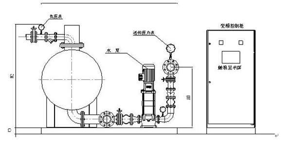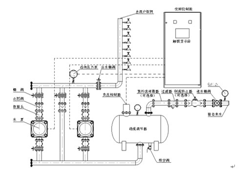 RWG系統(tǒng)智能型無(wú)負(fù)壓變頻供水設(shè)備是由穩(wěn)流調(diào)節(jié)器、負(fù)壓抑制器、水泵機(jī)組、智能變頻控制柜、遠(yuǎn)傳壓力表、各種閥門(mén)管件等組成。其原理圖如下所示。